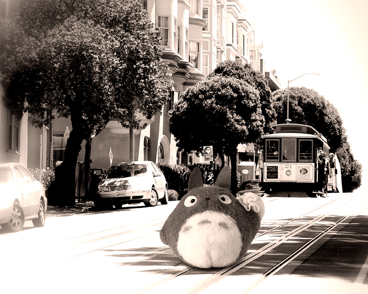 totoro is a japanese animation, he is a tree spirit. I like to do something creative, so I make him travel everywhere.